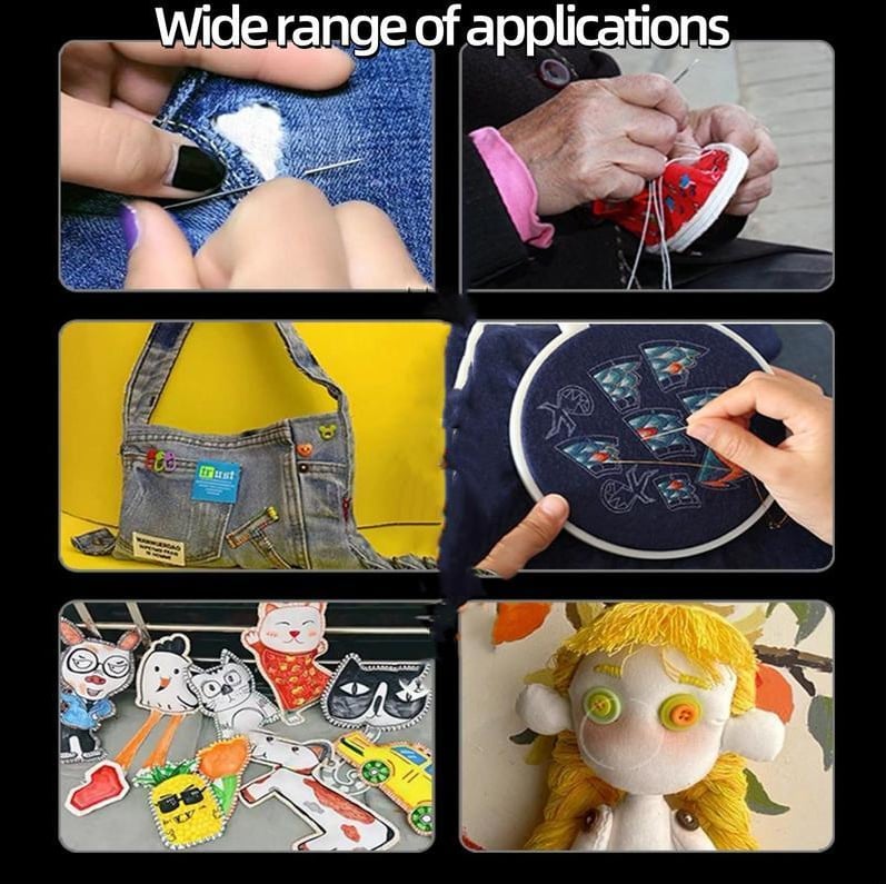 - High-grade steel needles: Won’t bend, rust, or dull easily, even when sewing through thick fabrics.