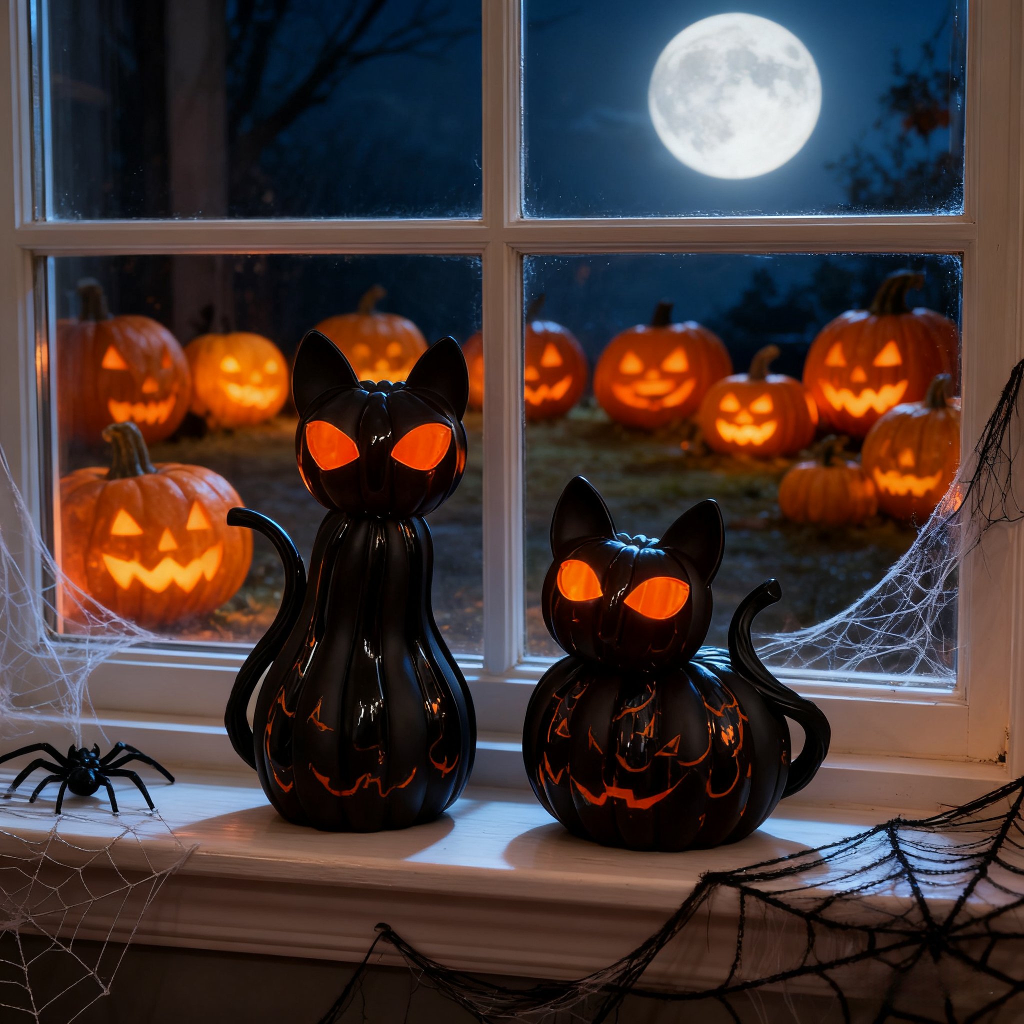 1 × Black Cat Pumpkin Figurine with glowing, color-shifting eyes