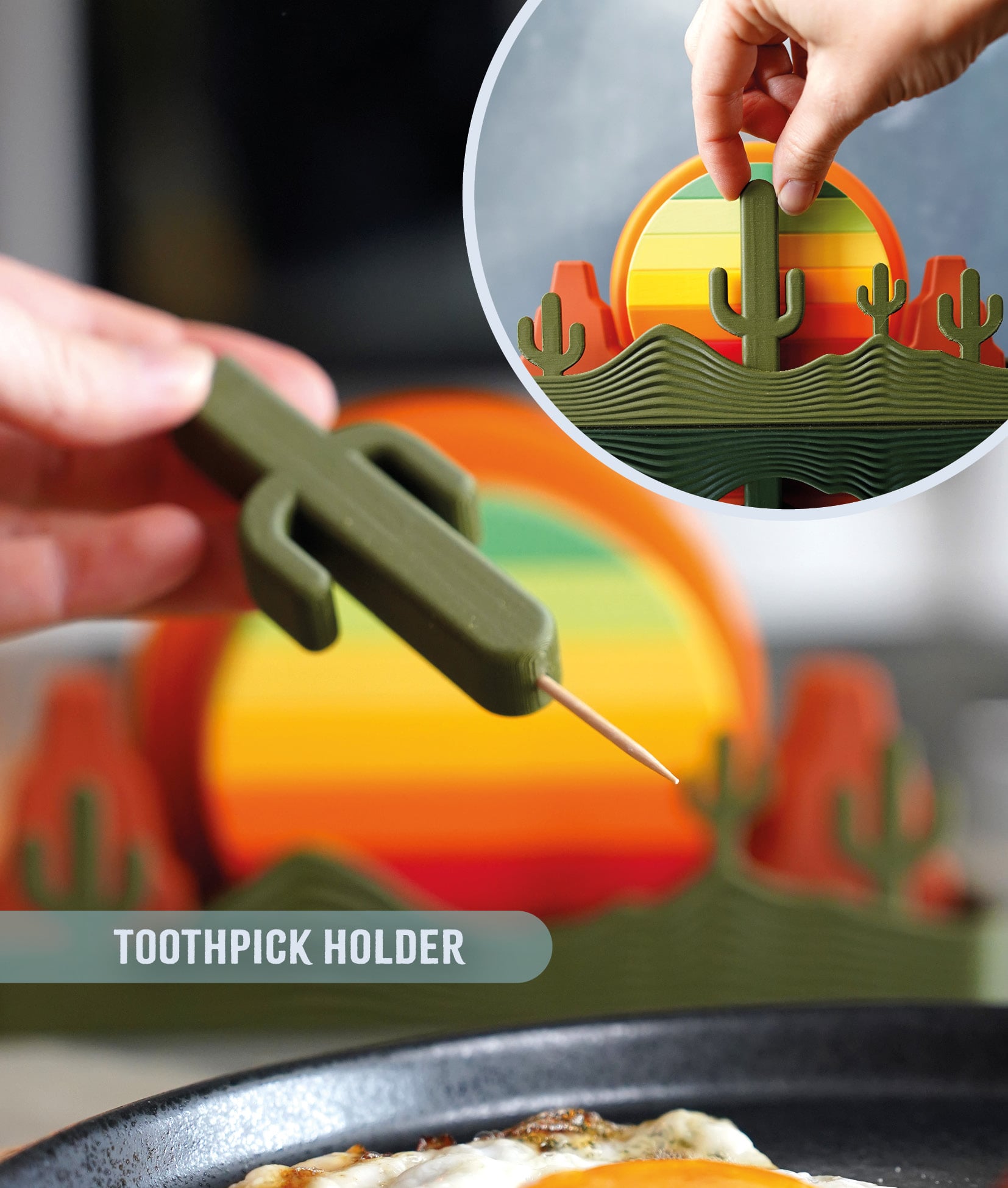 Bring the golden hour straight to your table with the Sundowner Coaster Set! This playful desert-inspired set includes a cactus toothpick holder, mountain salt & pepper shakers, a sunny bottle opener, and six coasters in a tidy tray. Perfect for summer BBQs, cocktail nights, or as a conversation-starting gift.