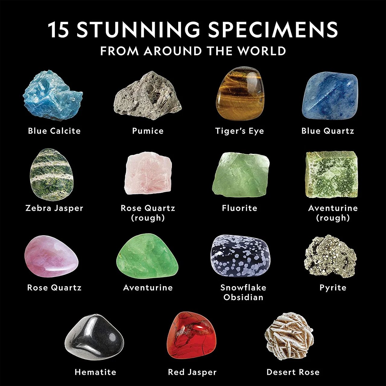 ULTIMATE ROCK COLLECTION FOR KIDS - A perfect standalone collection or addition to any kid’s rock collection. Includes rough and polished samples of Aventurine, Rose Quartz, stunning Snowflake Obsidian, Desert Rose, Red Jasper, Blue Quartz, Pumice, and meteorite specimens as well. Makes an excellent STEM gift for girls and boys!