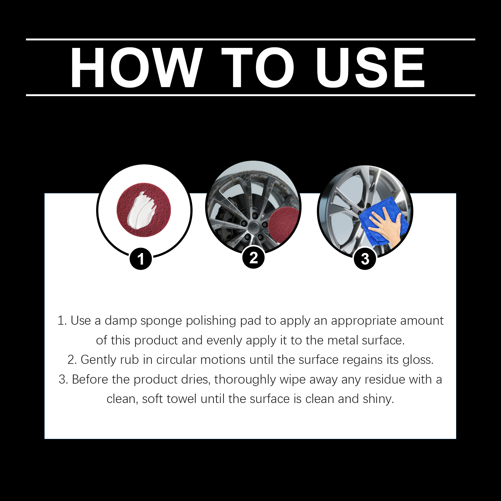 Step 2: 👉 Use a clean microfiber towel to remove excess polish. 👉 Buff in the same linear direction for a mirror-like finish 🌟.