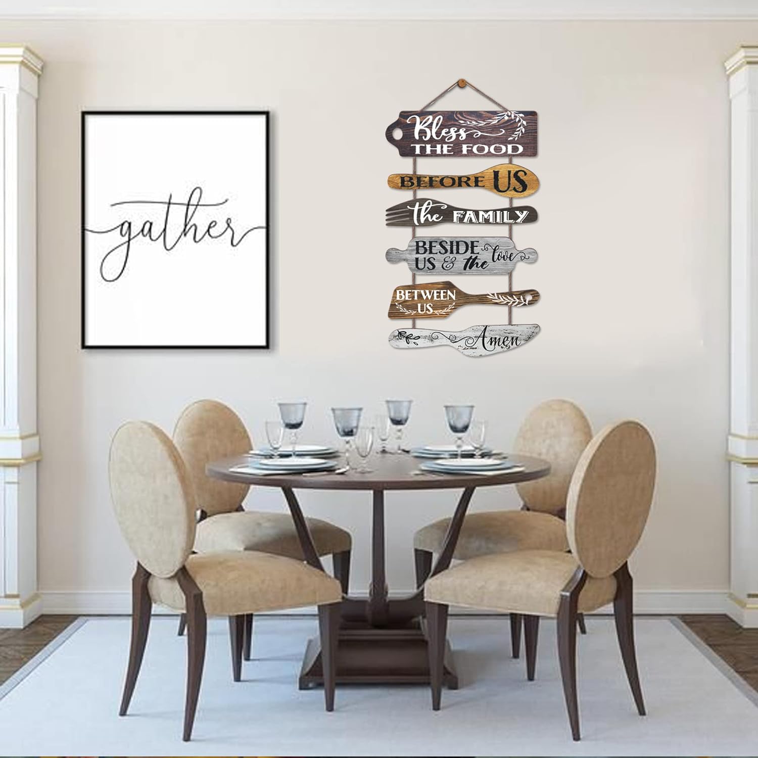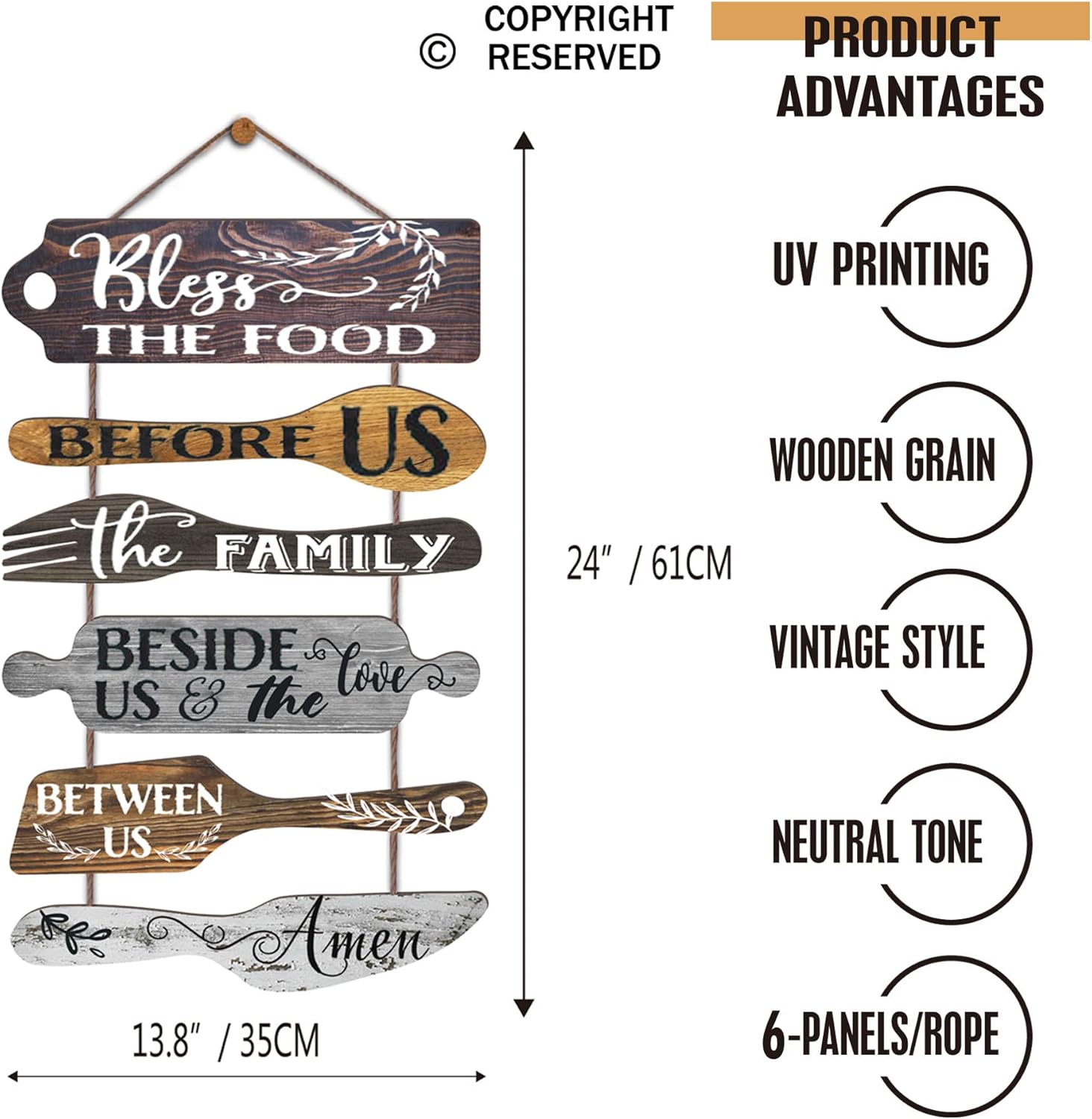 FARMHOUSE KITCHEN DECOR: Consists of 6 piece cut out collage plaques with pop saying: bless the food before us, the family beside us, and the love between us, Amen. Remember daily prayer before meal,very devoutly thank God for the food,cherish food and love each other. Distressed & rustic looking for your dining room, kitchen. Printed withreligious & lovely words.